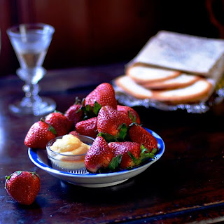 Pour crème anglaise in your dish of choice, drizzle on some basil jelly and add strawberries and then enjoy the sheer decadence of dipping the strawberries in the thick scented cream whilst munching on those tuiles. You can also have a dish of jelly and one of crème anglaise! You may want to gild that lily and have St. Germain on the side. It tastes like Spring with alcohol.