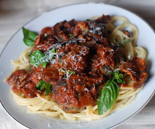 Oh my those meatballs ... I haven't had pasta with meatballs since I started eating meat again! This looks like the ticket .. I just need to get some Rat Pack music because every time I make an Italian dish I want to hear some ... I believe in themed music to cooking, even if it is cliche. (And your chorizo suggestion for the tortilla is spot on by the way.)
